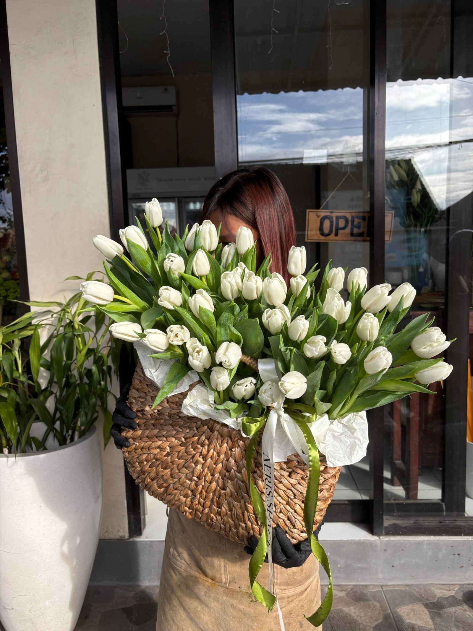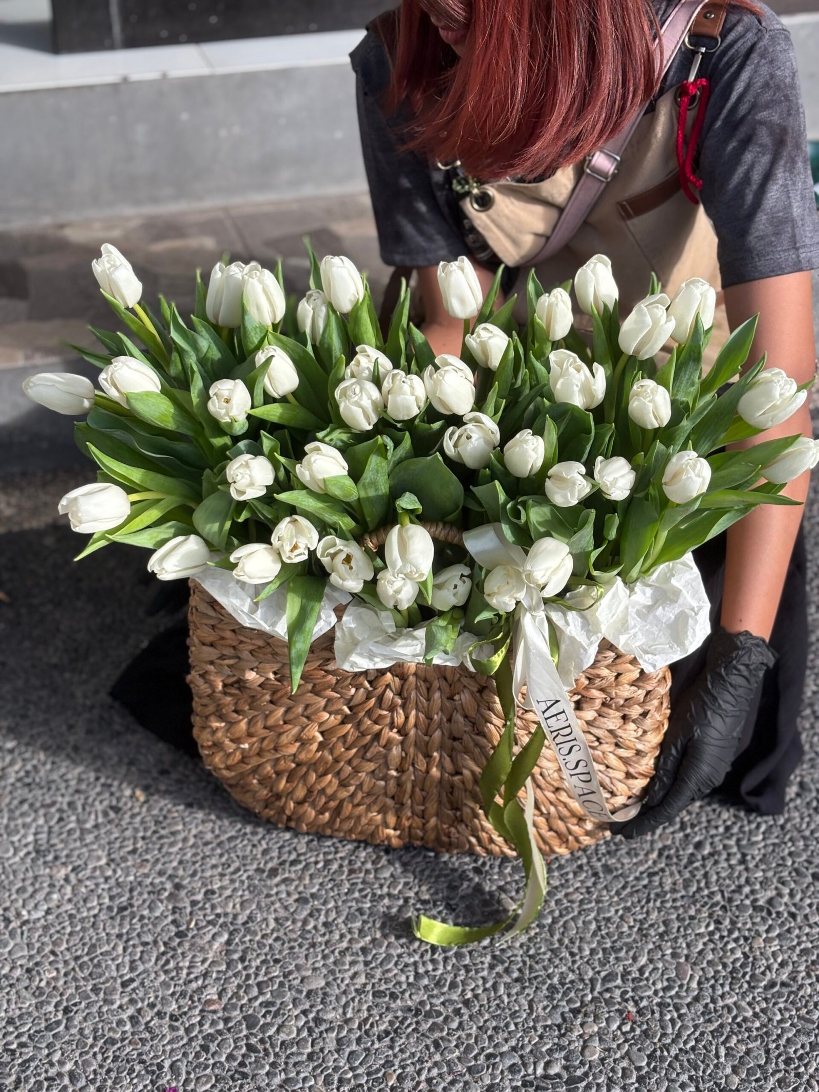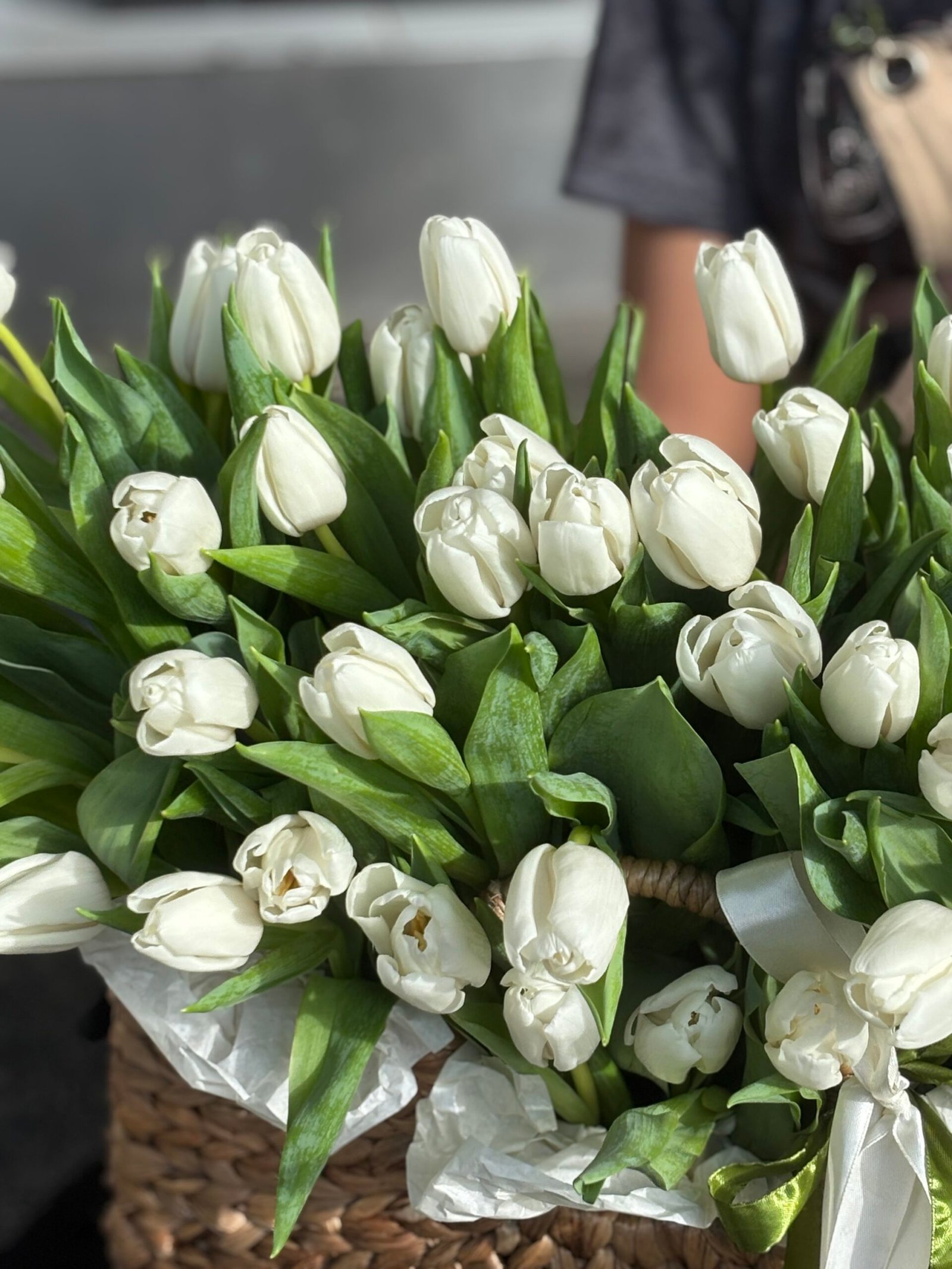 41 tulips in woven basket