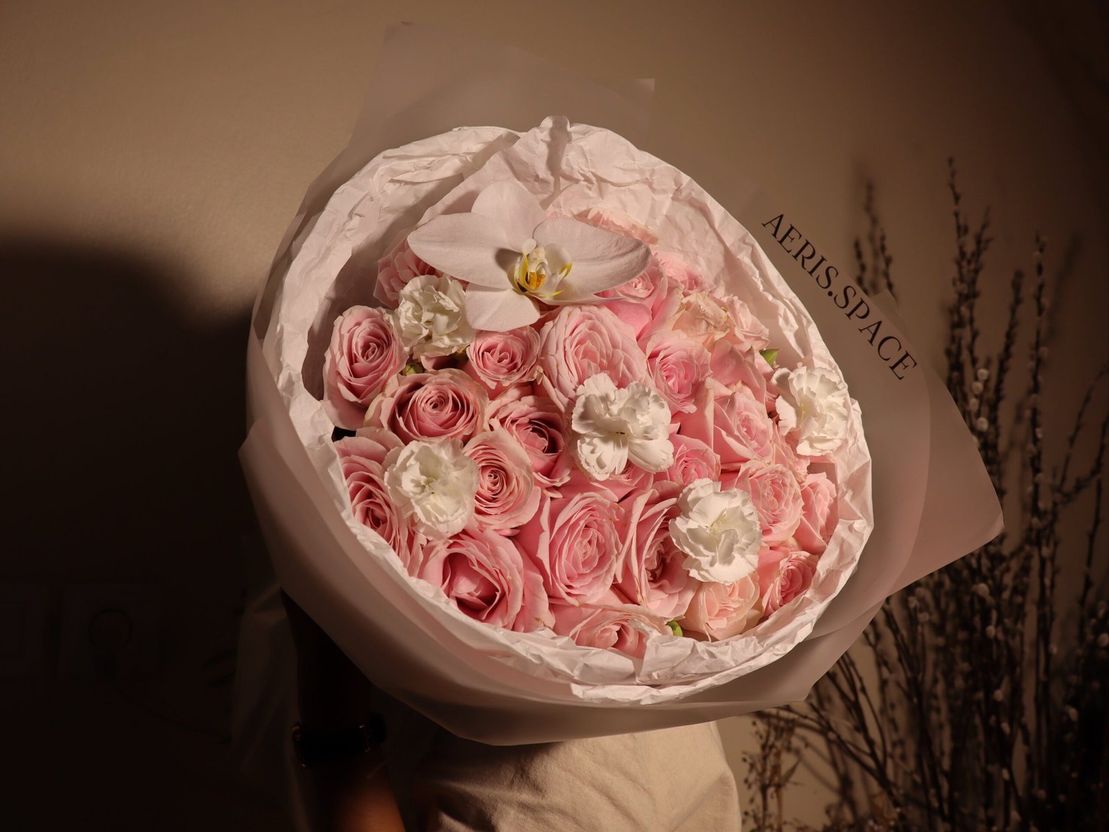 A delicate pink rose bouquet in Canggu, Bali. 45 stem soft pink semiholland roses mixed with white phalaenopsis and white carnations.